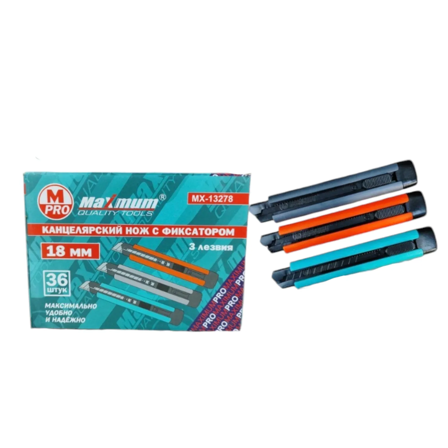 Нож канцелярский/строительный с кнопкой фиксации от "Maximum Quality Tools" предназначен для разрезания гипсокартона, бумаги, обоев, картона, ковролина, линолеума и т.п. Стильный пластиковый корпус выпускается в 3 цветах и дополнен металлической направляющей, а также отсеком для запаски. Общая длина ножа 160 мм, ширина 30 мм. Усиленный канцелярский нож поставляется с 3мя чернеными лезвиями толщиной 0.6 мм.